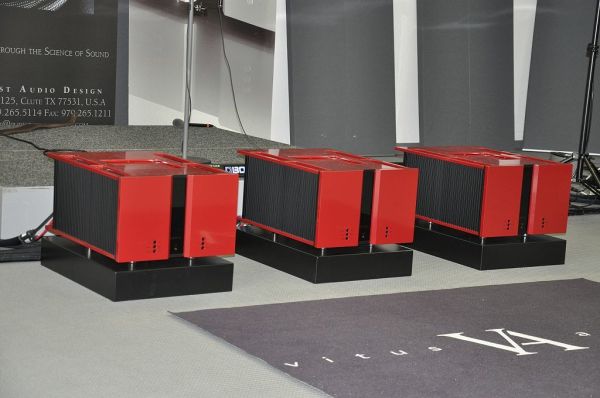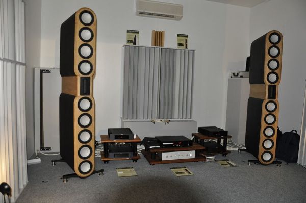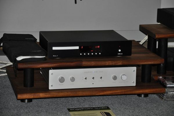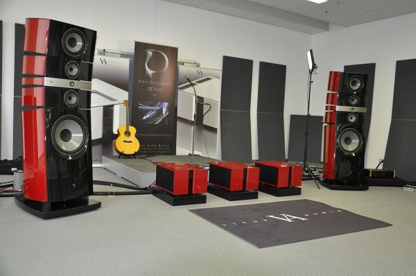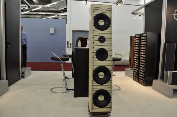 Klanglich überzeugend war diese Vorstellung mit mannshohen aber schlanken Lautsprechern von Engelholm Audio. Die insgesamt 9 Thiel Bass-Chassis pro Lautsprecher erreichen die Fläche eines 18" Bass-Chassis. Durch die Verteilung auf viele kleine Chassis ergeben sich jedoch deutliche Vorteile in Sachen Geschwindigkeit und Präzision des Basses.