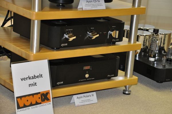 Gleich am Anfang stattete ich dem Vorführraum der Avimex Audio Vision GmbH einen Besuch ab. Herr Anton Suter verstand es wiederum, eine Top-Anlage mit einem überragenden Klang in einer tollen Atmosphäre zu präsentieren. Zur mehr als 200'000 Franken teuren High End Stereoanlage gehörte Ayon Elektronik (CD-Player, Vorstufe und Mono-Endstufen), Lumen White Plattenspieler sowie Lautsprecher, Vovox-Verkabelung und ein Suonomondo-Klangholzrack. Fürs Akustiktuning kamen diverse Shun Mook Produkte zum Einsatz.