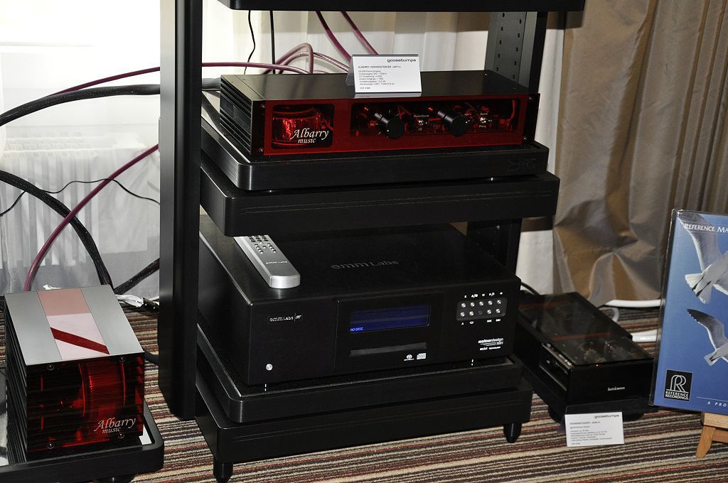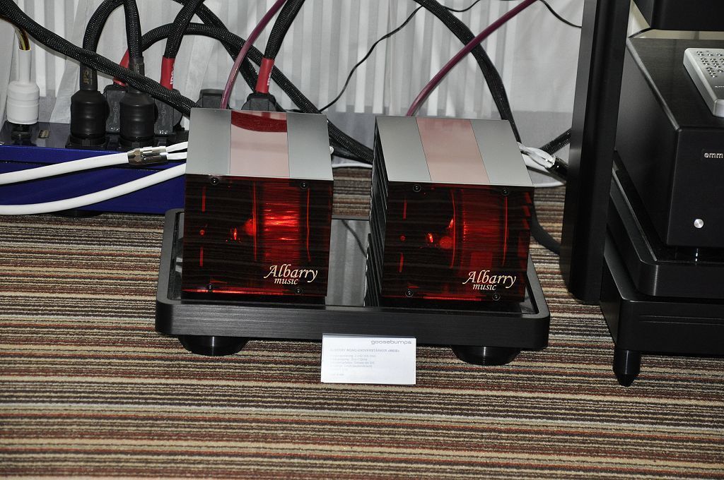 Die Goosebumps Audio GmbH sorgte mit ihrer Vorführung in der Tat für Gänsehaut! Zum Einsatz kamen Lautsprecher von Vandersteen Audio, eine Vor- und Endverstärker-Kombination von Albarry Music, ein Brinkmann Oasis Plattenspieler, einem Monk Audio Phono-Vorverstärker, Rack und Backen von HRS sowie die Verkabelung von JPSLabbs. Eine Messe-Highlight in der mittleren Preisklasse von ca. CHF 50'000.-