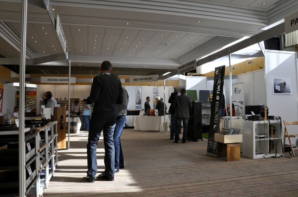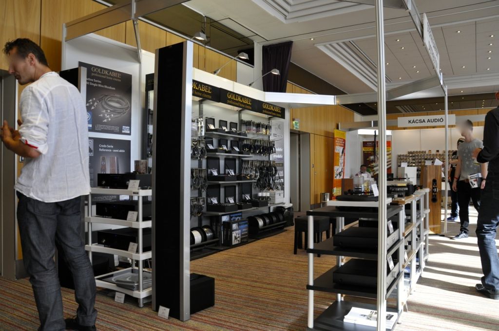 Als Gemeinschaftsraum diente heuer nicht mehr der Kongresssaal, sondern der kleinere Raum "Zürich II". Was die Atmosphäre angeht, war dieser Schritt in jedem Fall richtig. So konnte man eine Auswahl von Clearaudio-Plattenspielern bestaunen, bei Big Fun Music in den LPs stöbern (und auch welche kaufen), Kopfhörer von Stax ausprobieren und sich über verschiedene weitere Produkte - vor allem Kabel - informieren.