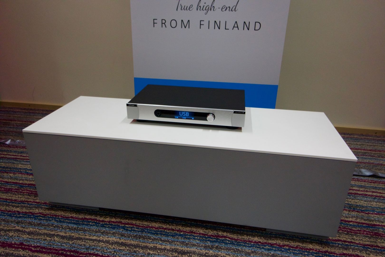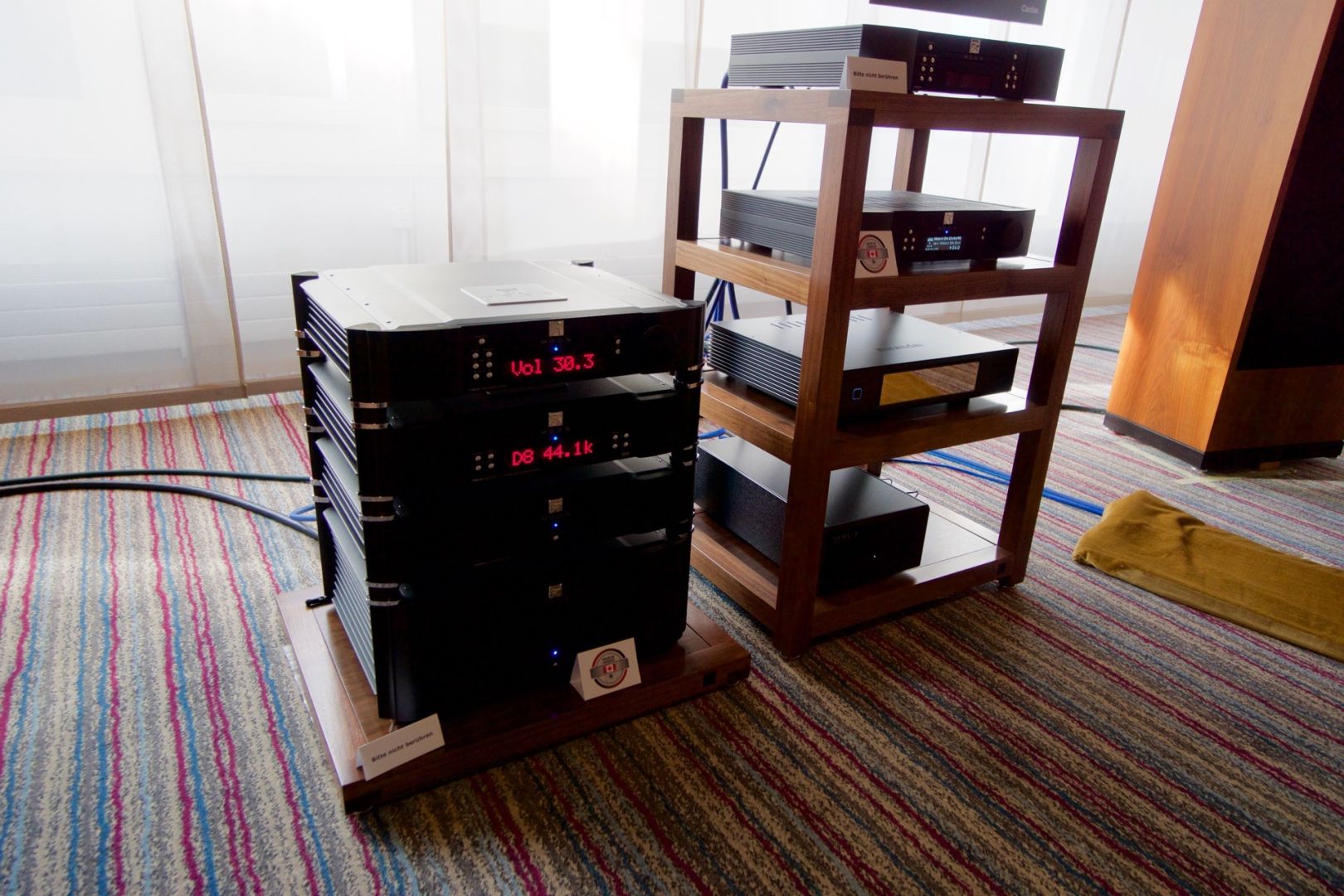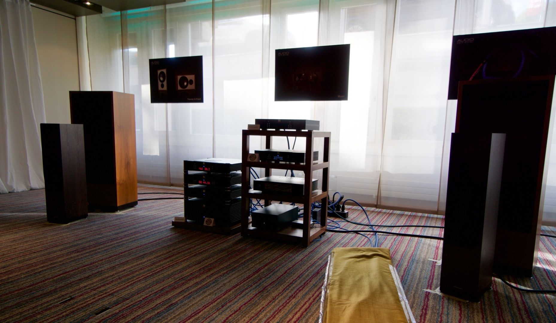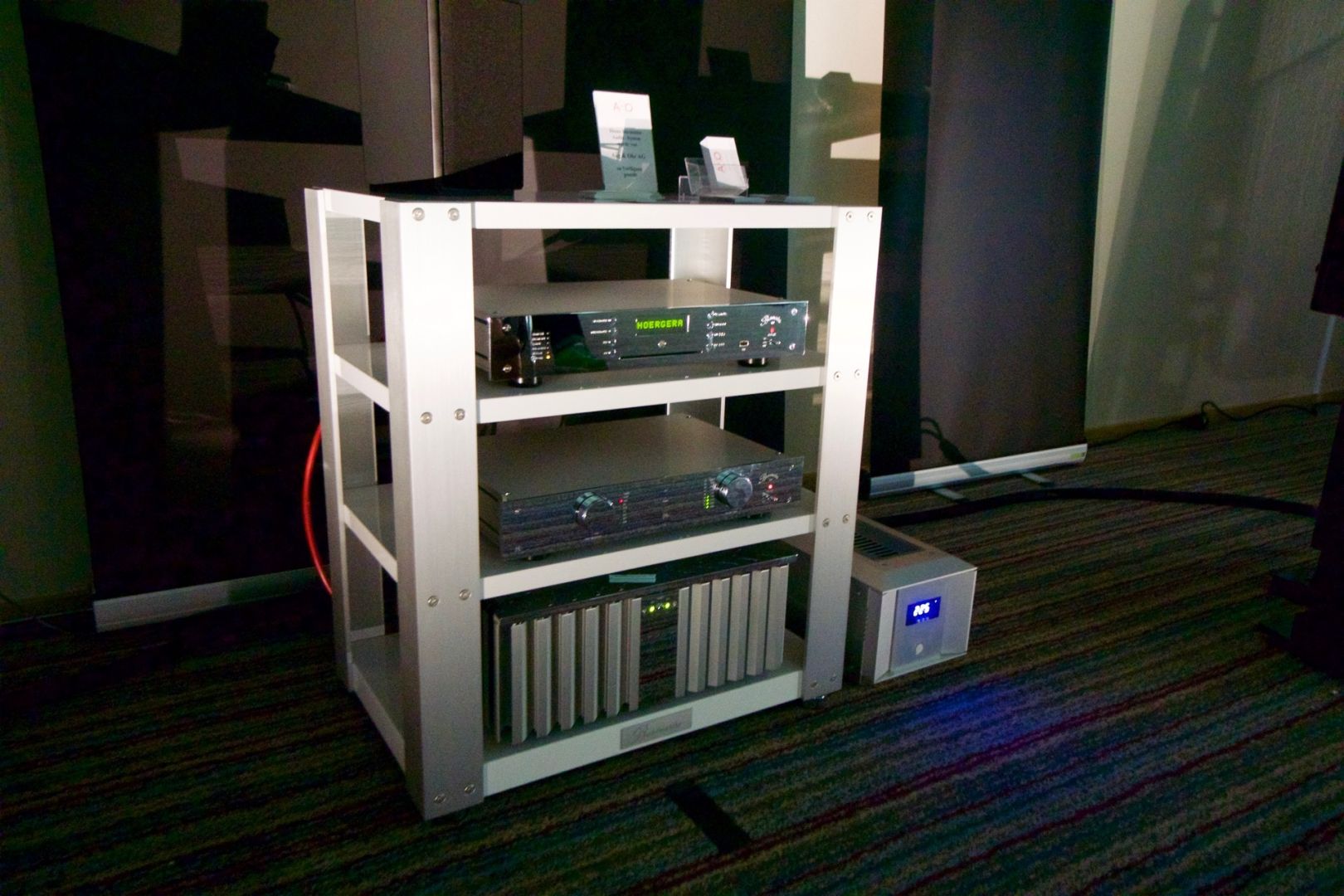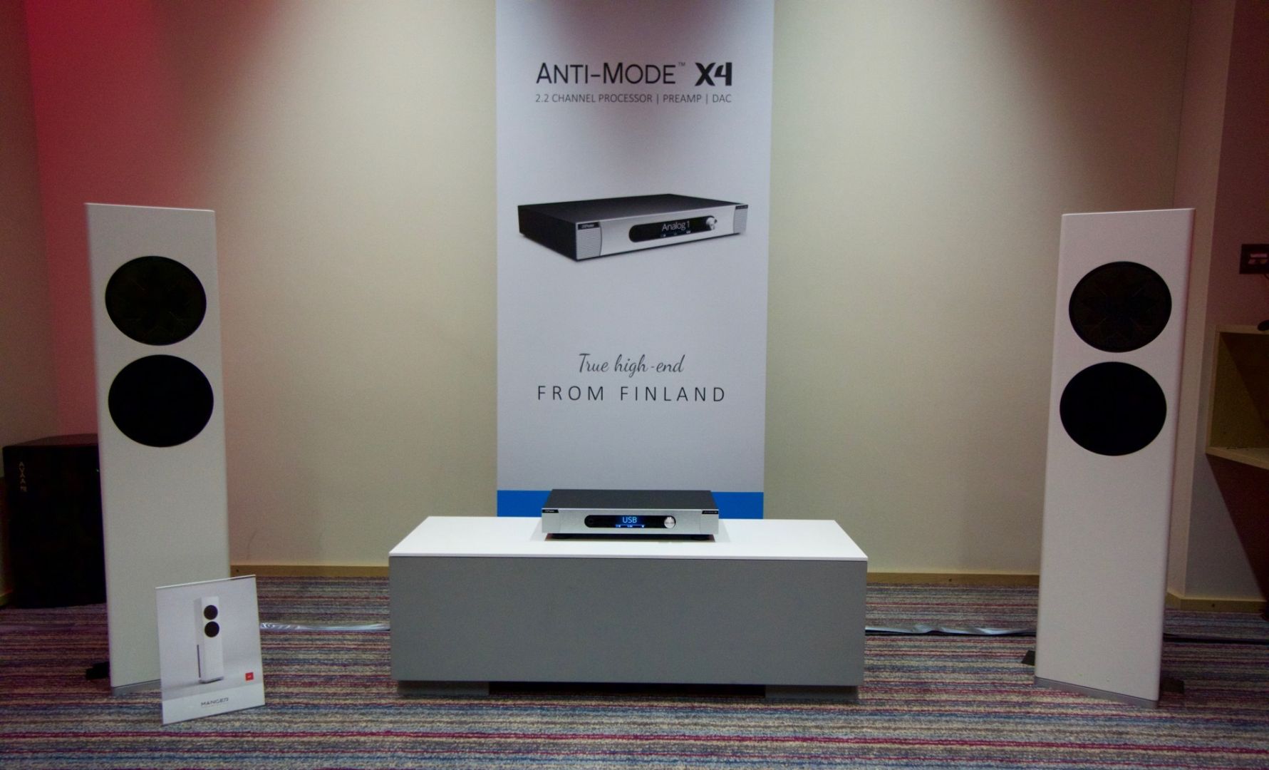 Hier wurden u.a. Aktiv-Lautsprecher von Manger vorgeführt. Als Vorverstärker und Prozessor kam ein Anti-Mode X4 zum Einsatz. Der Mittel- und Hochton wusste zu überzeugen, allerdings mangelte es am Bass.