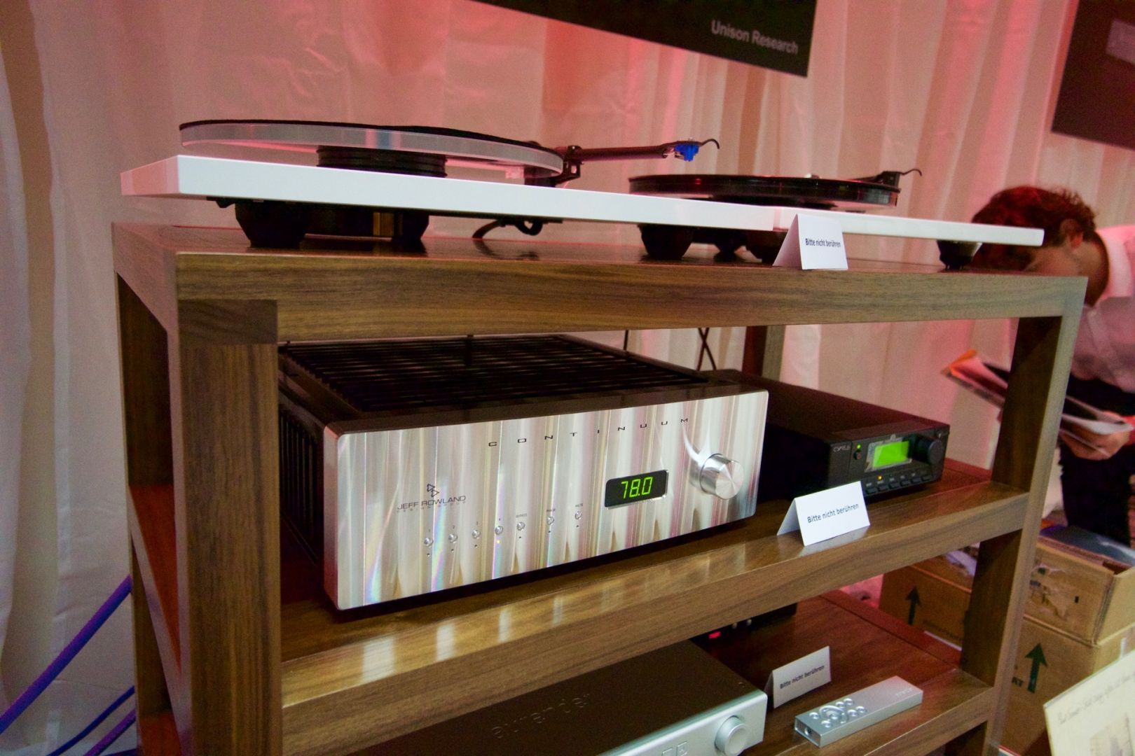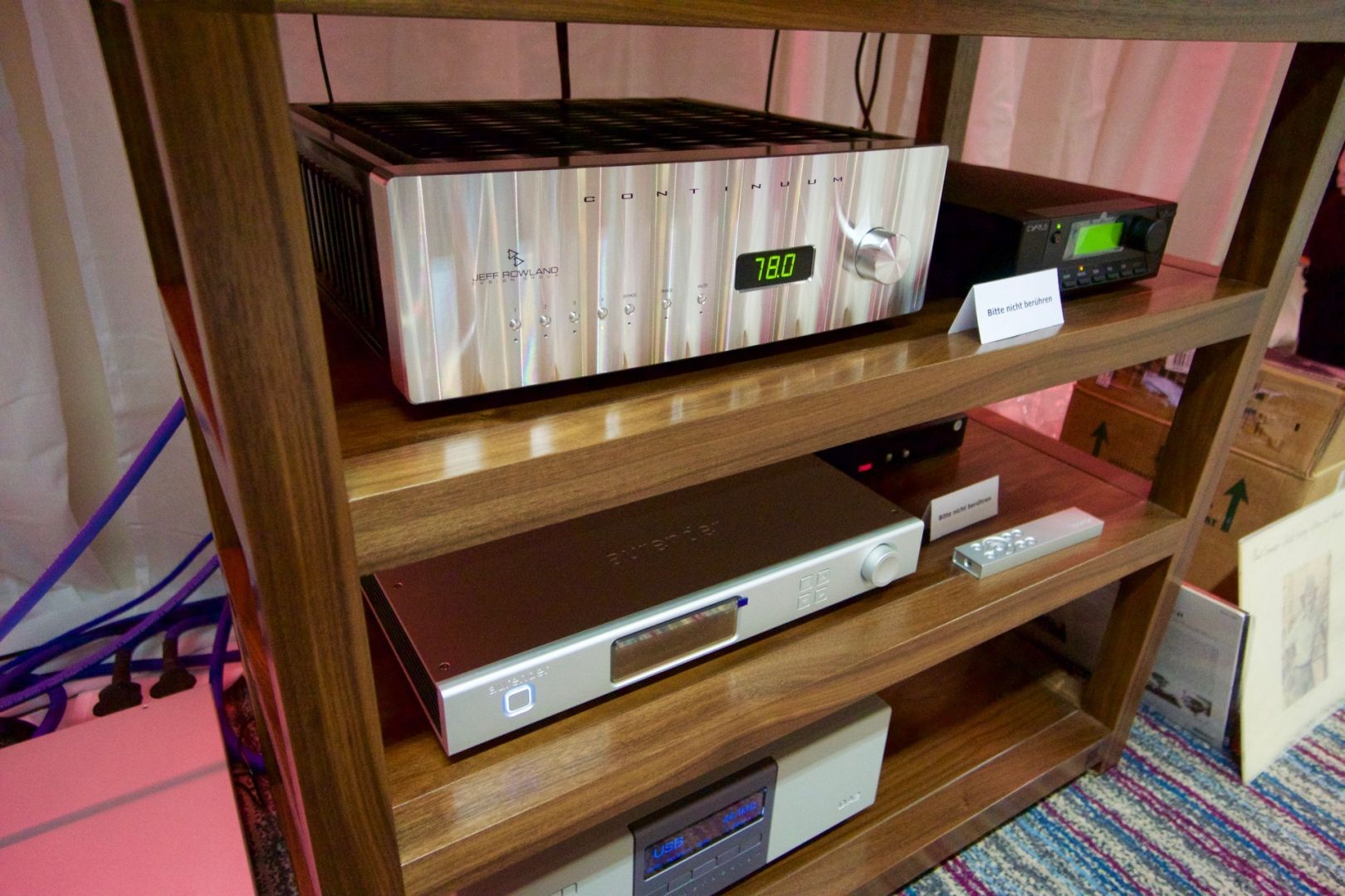 AudioSphere führte in zwei verschiedenen Räumen vor. Die Vorführung der Spendor Lautsprecher an Elektronik von Moon klang dünn und flach - überhaupt nicht überzeugend. Im zweiten Raum war es dafür umso besser. U.a. mit Elektronik von Jeff Rowland und Rega Plattenspieler.