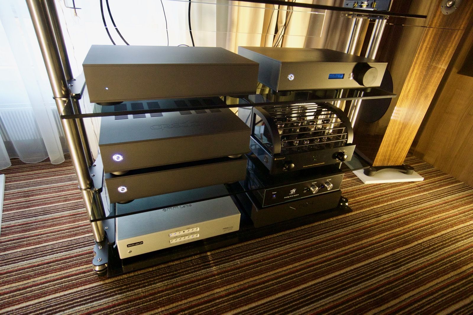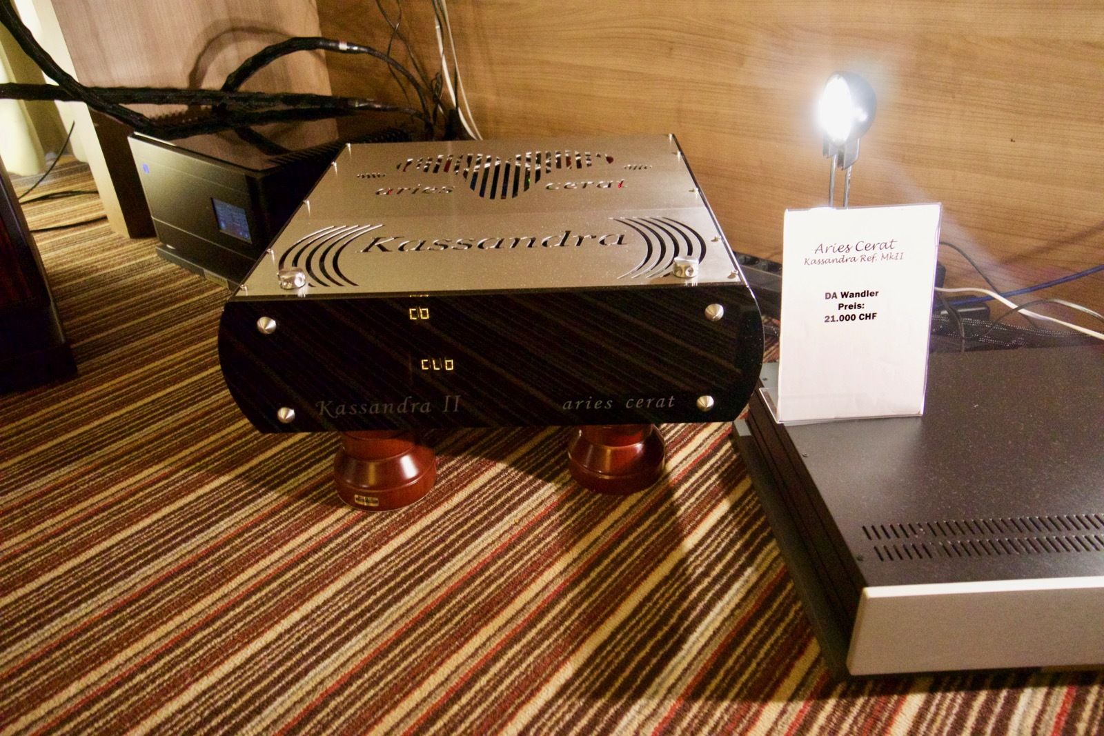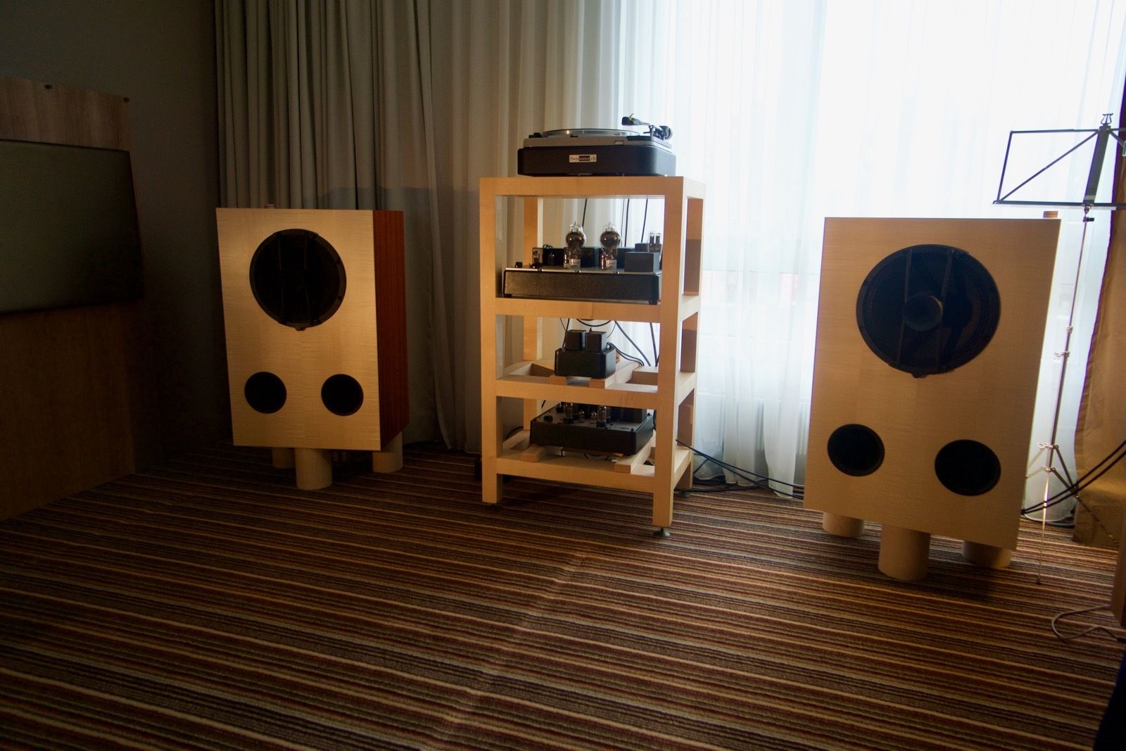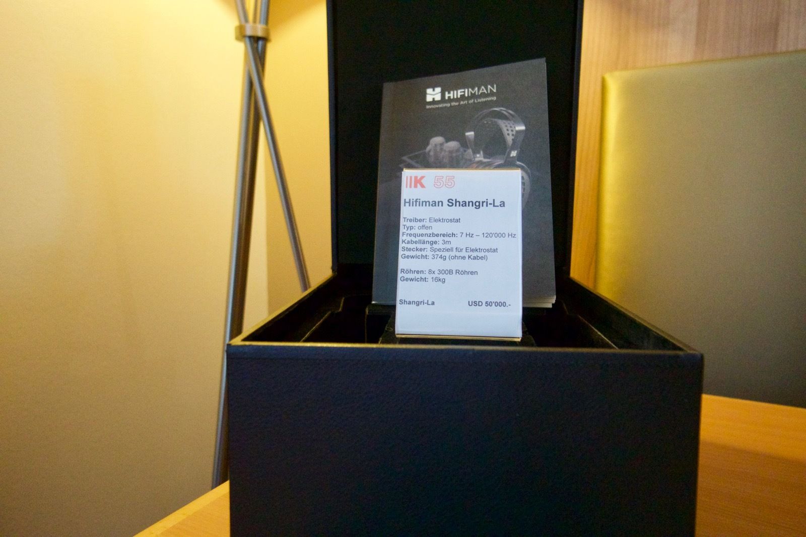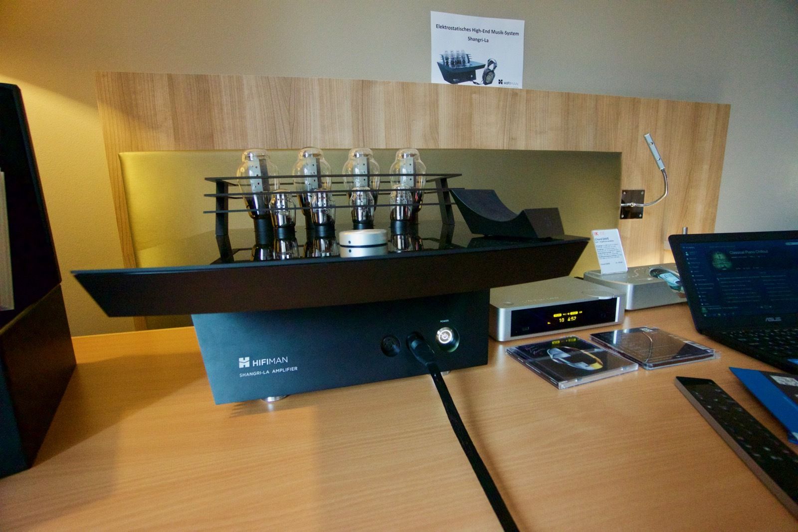 Hier konnte man verschiedenste Kopfhörer aller Preisklassen ausprobieren. Herausragend war dabei vor allem der Hifiman Shangri-La als elektrostatischer Kopfhörer mit einem extravaganten Röhrenverstärker. Was ich gehört habe, war beeindruckend. Auch wenn man durch die offene Bauweise des Kopfhörers stets die Gespräche der im Raum anwesenden Personen im Hintergrund hörte.