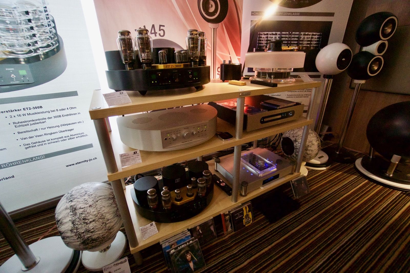 Hier war ich dieses Jahr etwas enttäuscht: Die zum Zeitpunkt meines Besuchs spielenden kleineren Lautsprechern mit Subwoofer-Unterstützung wussten nicht zu überzeugen. Es fehlte einiges beim Übergang zum Bassbereich. Schade, denn die interessanten Röhren-Verstärker von Herrn Zimmermann können deutlich mehr.